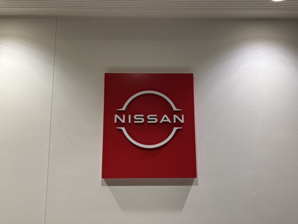日産の赤いロゴが映える受付カウンターもピカピカで、スタッフ一同テンション上がってます😊