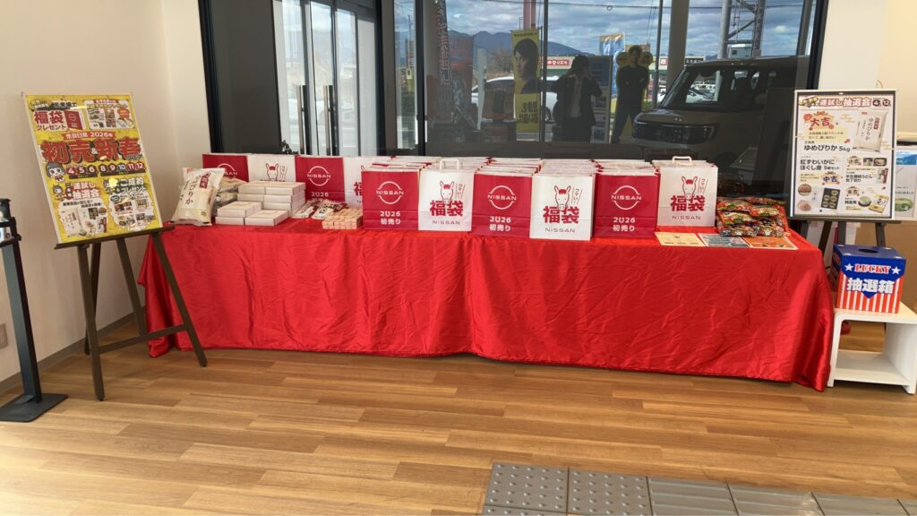 テーブルいっぱいに並んだ日産の福袋は、見ているだけでもワクワクします🎁✨